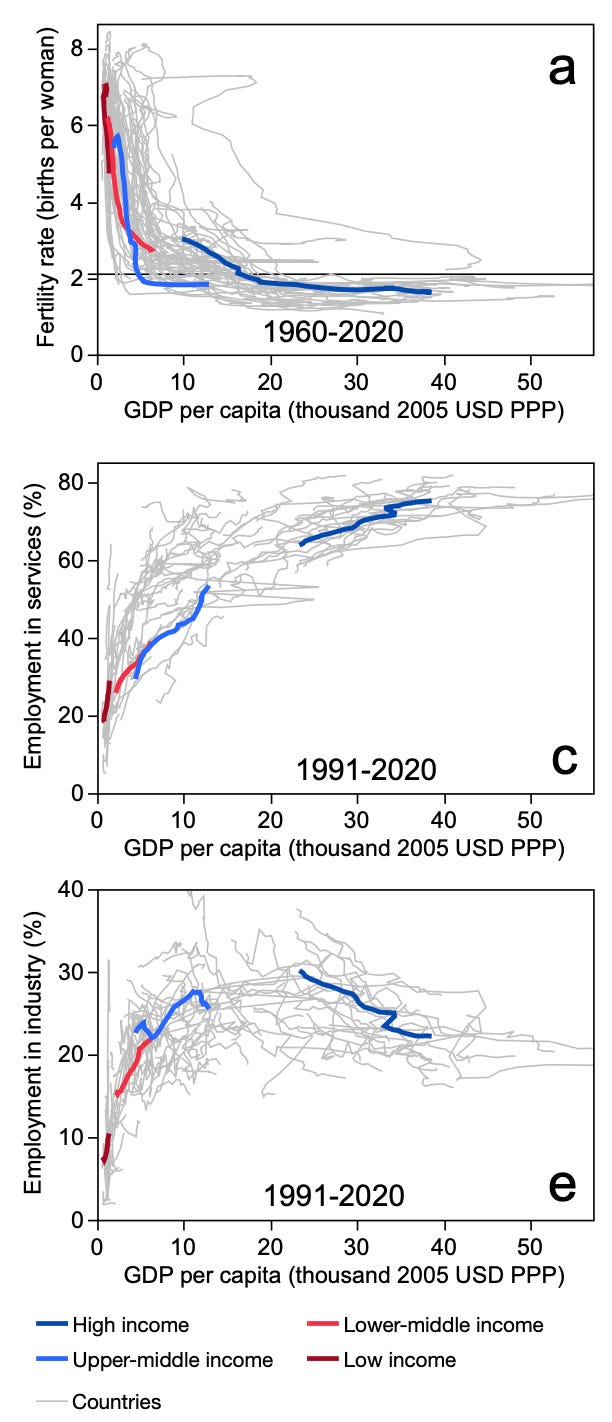In other words, very poor countries tend to have too little capital (including human capital) and consumer spending power, too much uncertainty and instability, and too-unattractive investment climates, to power high economic growth rates. Very rich countries have slow growth because of their aging populations and service-oriented economies. Middle-income countries grow the fastest because they are rich enough to have manufacturing capital and an emerging middle class, and poor enough to still have cheap labor and lots of room to improve their productivity. The graphs below show how fertility rates, and employment in industry and services—key drivers of this pattern—vary with GDP per capita.