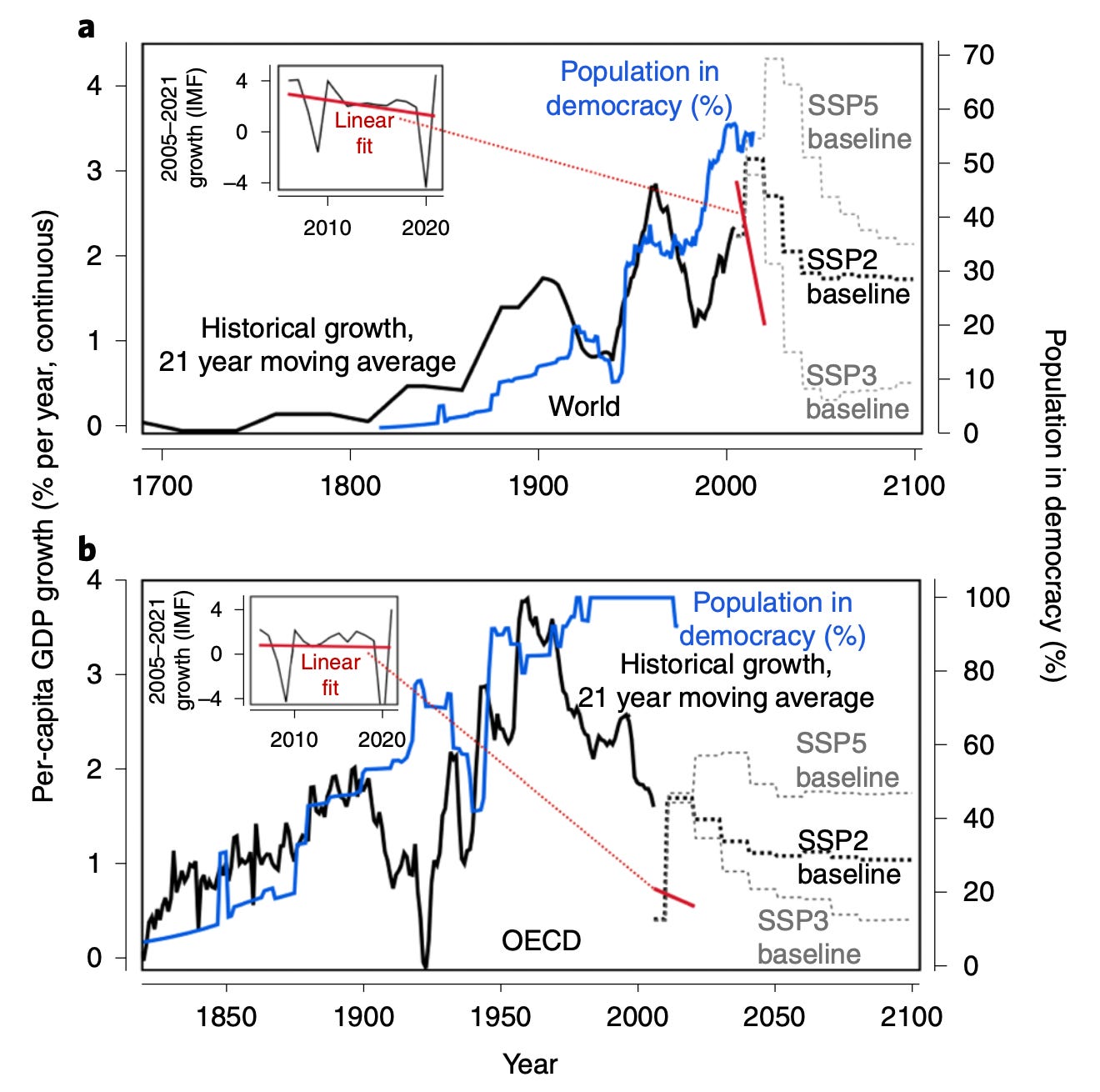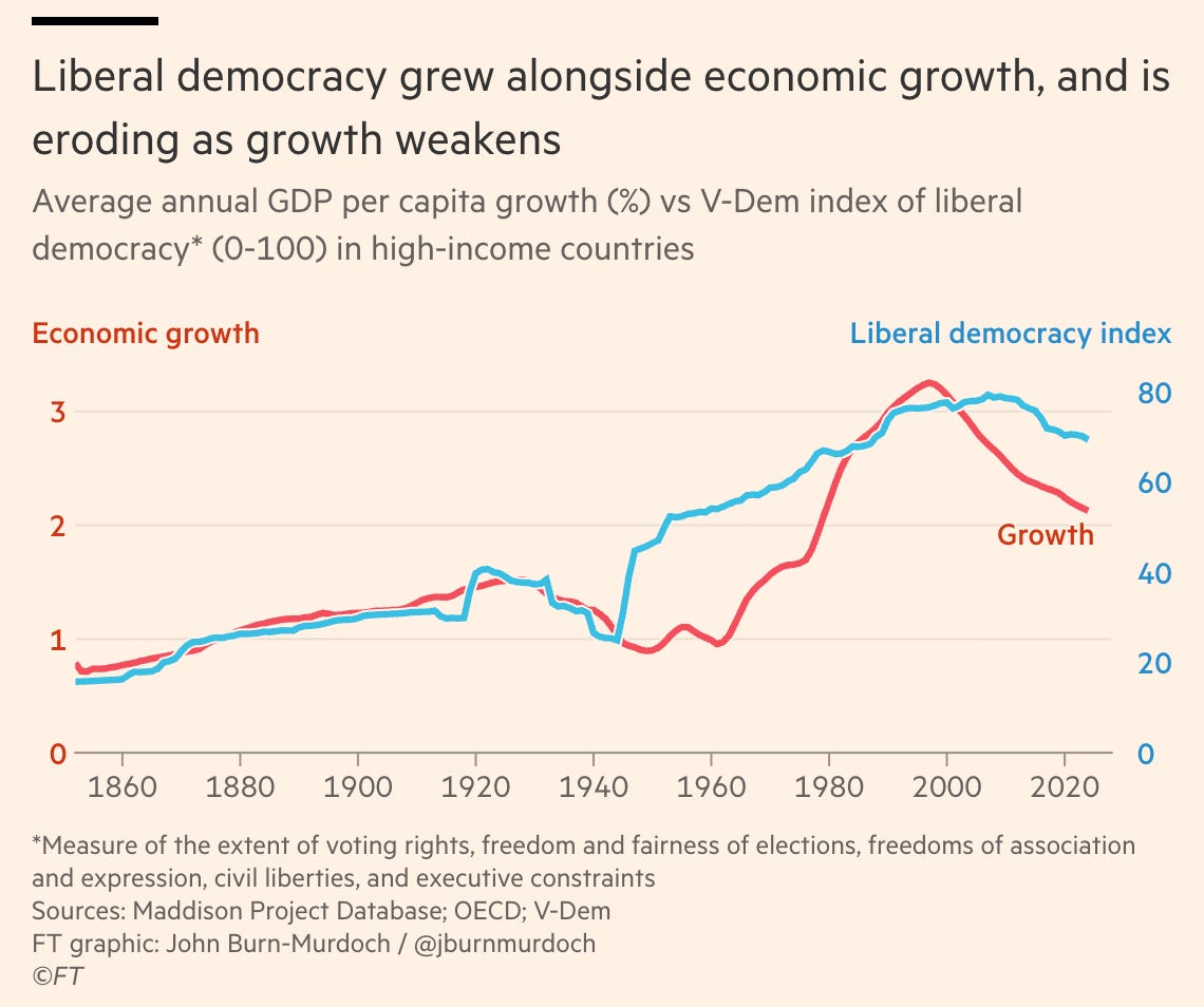 As my colleagues and I showed in a 2021 paper, the rise of global democracy closely tracked the rise of global GDP per capita growth since the 1800s (see below). As growth has slowed over the past several decades in rich countries, democracy has broadly come under strain. John Burn-Murdoch discussed this challenge in his viral article this past week.