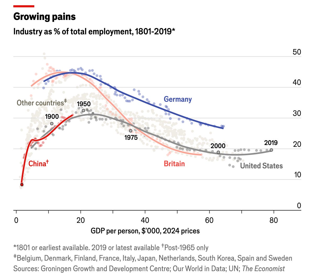 Last April—as the debate surrounding President Trump’s global tariff policies was heating up—The Economist plotted industry employment as a share of total employment for several major countries, going back to 1801, illustrating the pattern I highlighted above.