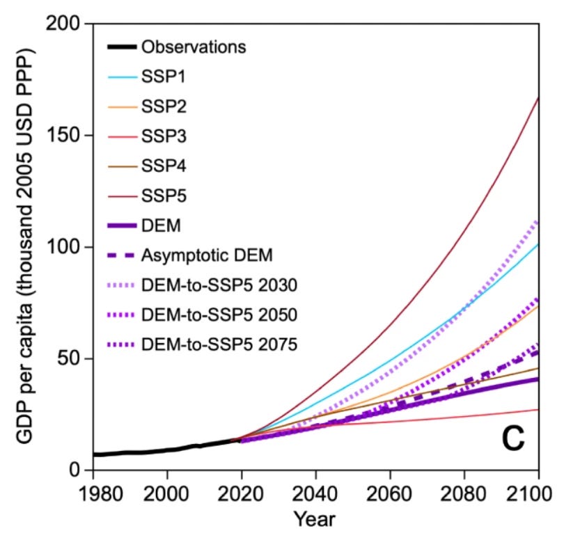 The graph below compares economic outlooks following historical development trends (our DEM, in purple, and a much more complicated model, called International Futures, or IFs, from our colleagues at the University of Denver, in pink) to outlooks from Shared Socioeconomic Pathway (SSP) scenarios used in climate change research, which roughly span the range of major expert and agency macroeconomic forecasts to 2100.