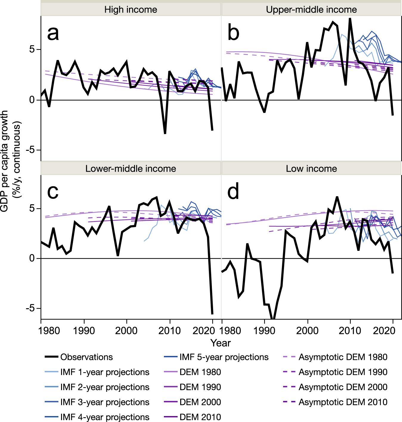 To illustrate just how stable these development patterns have been, we showed in our paper that you could have fit a simple, three-parameter model to the GDP per capita data above, in the 1980s (i.e. not using any data newer than that), and you would have done a substantially better job forecasting income-group GDP per capita growth in the 2000s and 2010s than the International Monetary Fund (IMF)’s short-term forecasts from the 2000s and 2010s. (We called our simple model a differential-equation model, or DEM, for short.)