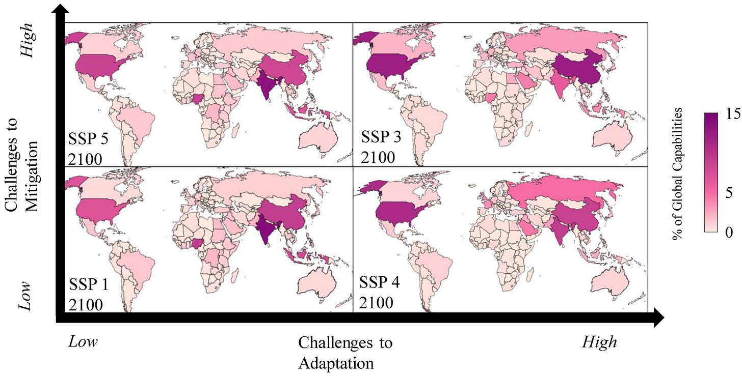 Discussions of 21st-century geopolitics sometimes muse about the fall of U.S. dominance, the rise of China, or even the rise of other countries, like India and Nigeria. Indeed, if we consider the full range of economic and population forecasts considered plausible by the UN, IPCC, and other major agencies, it is possible to get all kinds of 2100 geopolitical scenarios. For example, in a 2024 paper, Jonathan Moyer sketched out “capabilities” (measured by GDP x GDP per capita, which roughly approximates geopolitical power) in different SSP scenarios, finding that Nigeria and India become dominant superpowers by 2100 in scenarios with fast economic growth like SSP5 (see below).
