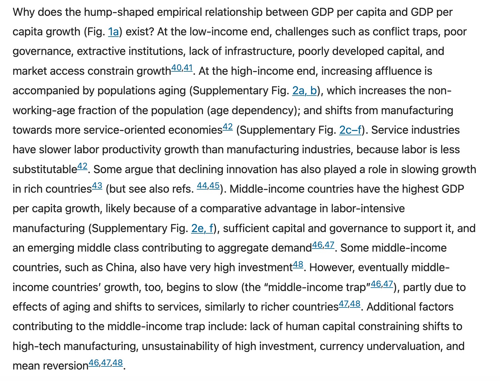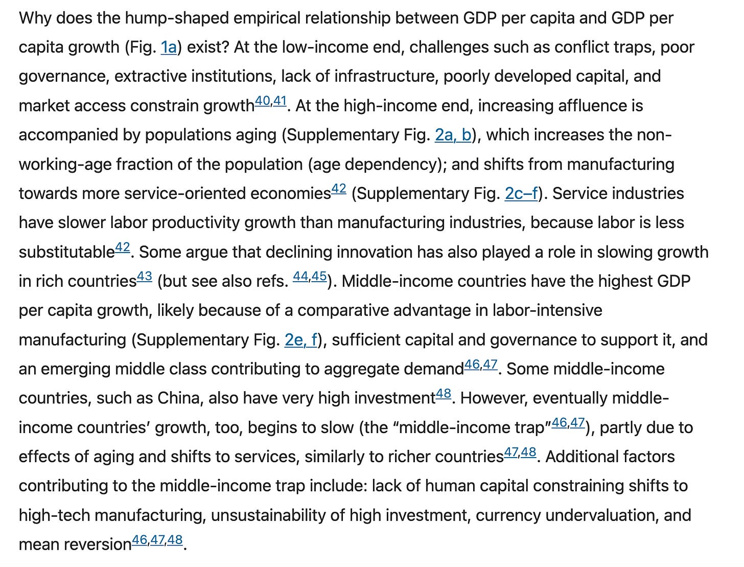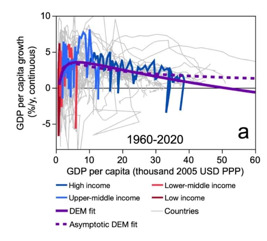 GDP per capita growth has followed a very stable, humped-shape pattern across GDP per capita levels since the 1960s at least, as my colleagues and I described in this 2023 paper. The pattern has some heterogeneity at the level of countries (especially small ones), but it is strikingly clear when one aggregates to income groups of countries.