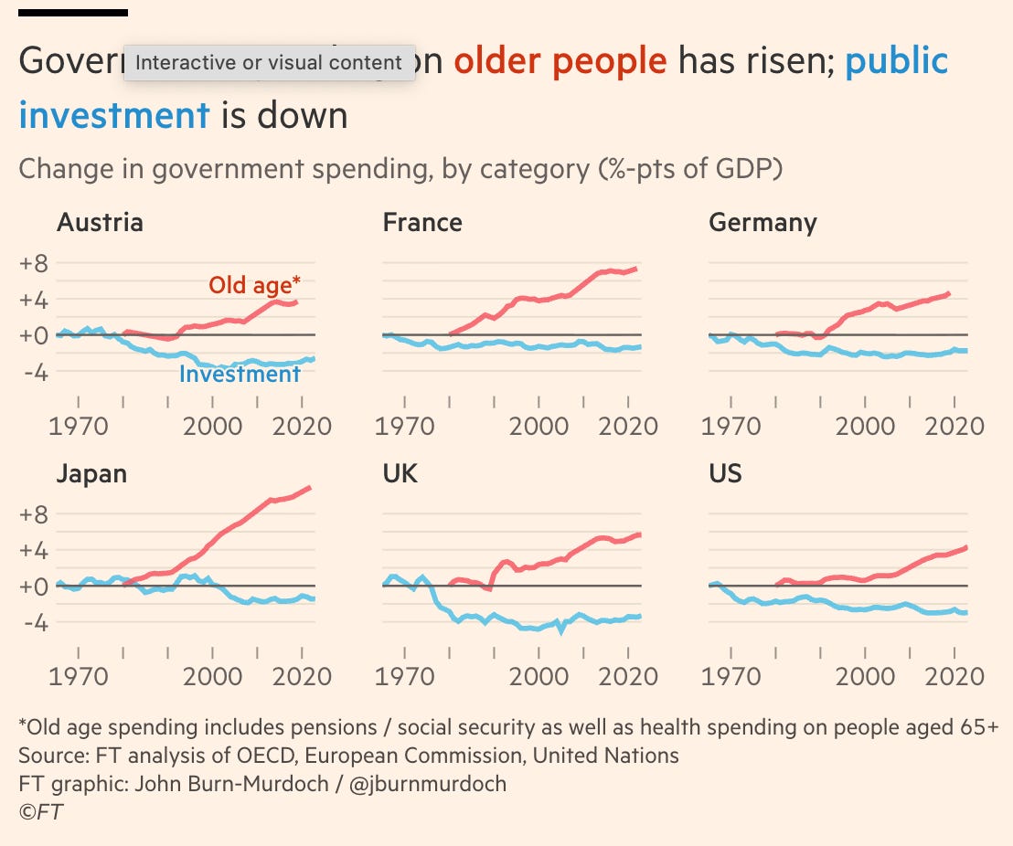 Slow and slowing per-capita economic growth poses a number of major fiscal and social challenges to democracies, as my colleagues and I review in our paper, and Burn-Murdoch discusses, too. Among other things, it strains public finances, makes our society more seemingly zero-sum and competitive, and creates gaps between young people’s expectations and reality that can fuel unrest and populism.