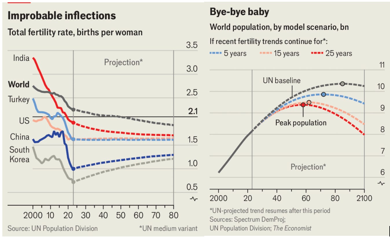 On this topic, I highly recommend following the work of Jesús Fernández-Villaverde, the world’s leading thinker on global population economics, in my estimation. He has shown how the United Nations (UN) projects population growth forward assuming that rapid, global declining fertility trends will suddenly stabilize or reverse. However, even if the declining fertility trends did reverse, but they first persisted for a few years to decades, global population in 2100 could be 1-2 billion less than the UN’s current baseline (medium) projection (see the graph below, from The Economist, based on Fernández-Villaverde’s work).