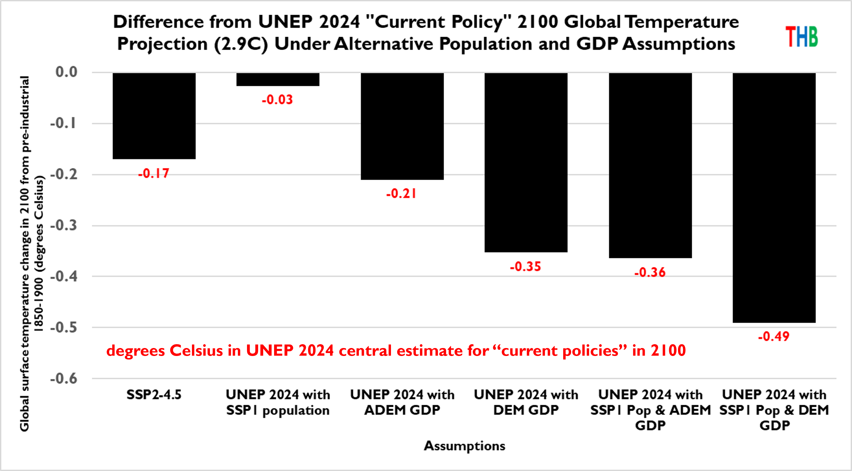 The last term (GHG emissions/GDP) represents how GHG-efficient our economy is. If we hold this efficiency constant, then reducing projected population and GDP per capita, compared to what the UN assumes, means we would also project less GHG emissions and less climate change.