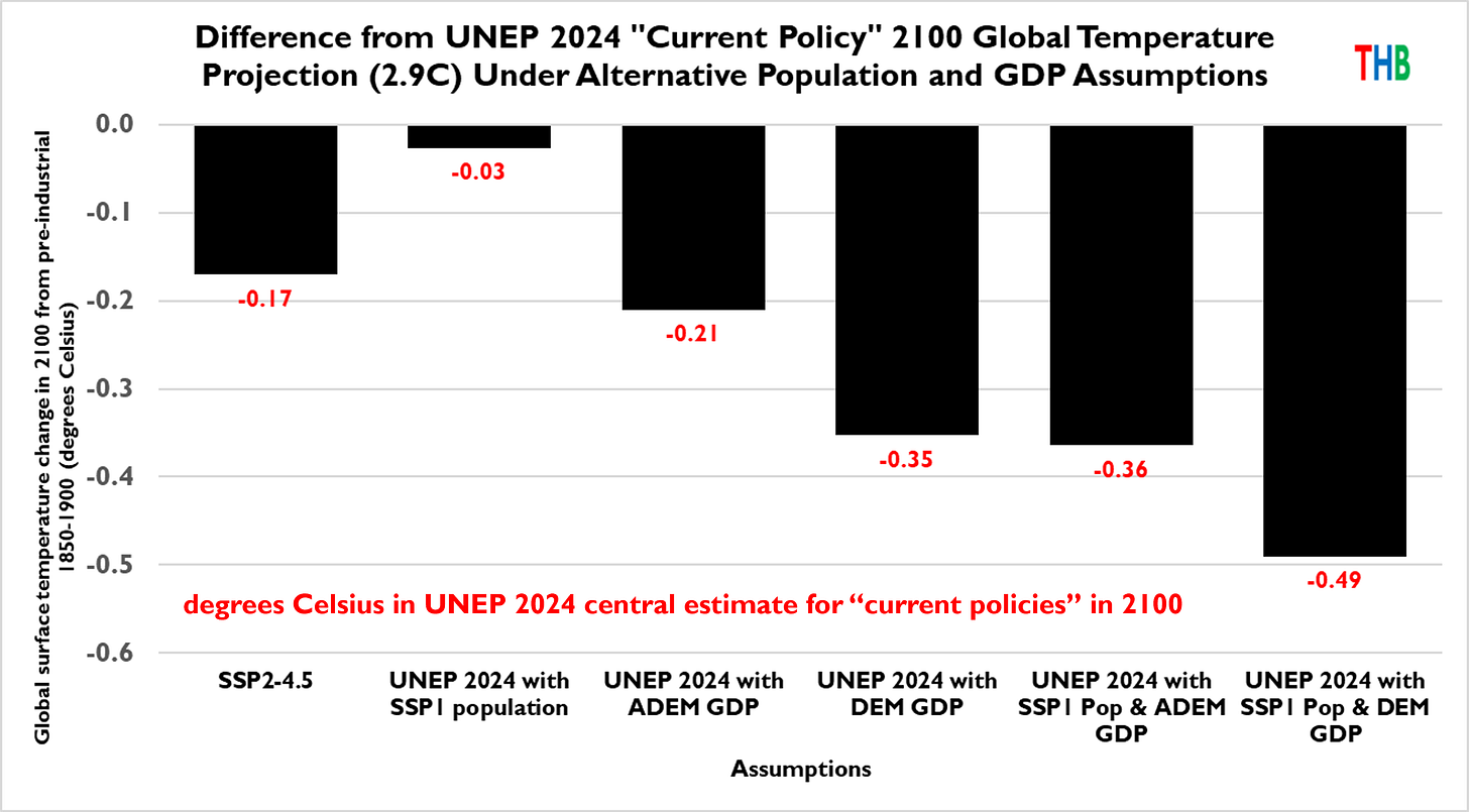 Roger Pielke Jr. explored this idea in an excellent 2024 post on The Honest Broker. He showed that, all else equal, assuming slower GDP per capita and population growth, more consistent with historical trends, brought the UN’s projection of global warming under current policies down from nearly 3 degrees C to just over 2 degrees C (by 2100, above pre-industrial temperatures). In other words, slowing economic and population growth might get us close to the 2-degree Paris Agreement goal under current climate policies.